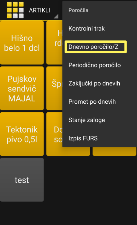 Dnevni zaključek naredimo tako, da izberemo meni - Poročila - Dnevno poročilo/Z.