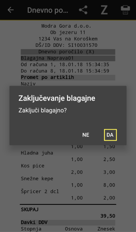 Pojavi se nam okno z dnevnim poročilom. Za dnevni zaključek blagajne pritisnemo Z v zgornjem desnem vogalu.